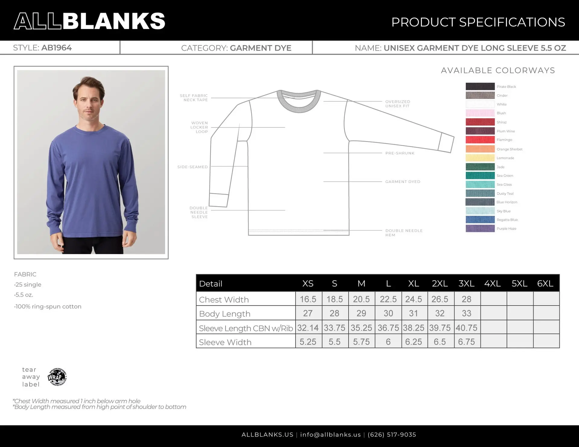 25 single, 5.5 oz 100% ring-spun cotton. Garment dyed.