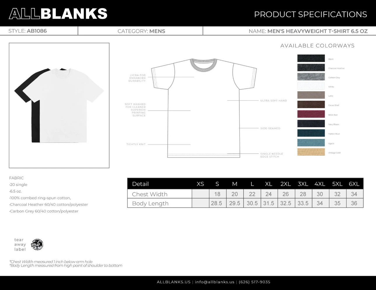 Single needle edge stitch, 7/8” 1x1 ribbed collar with Lycra for enhanced durability, ultra soft hand, side- seamed, tightly knit, superior printability.